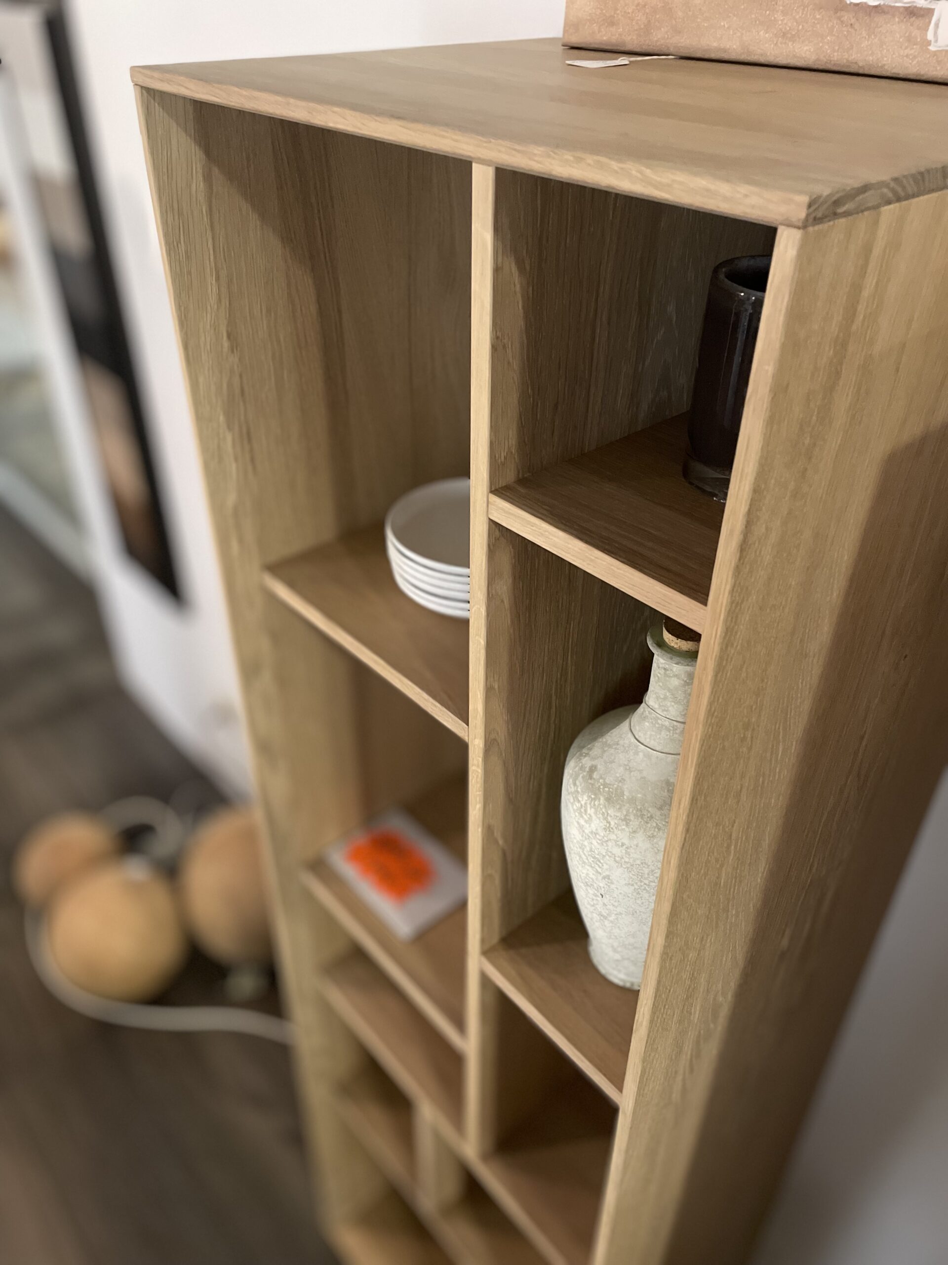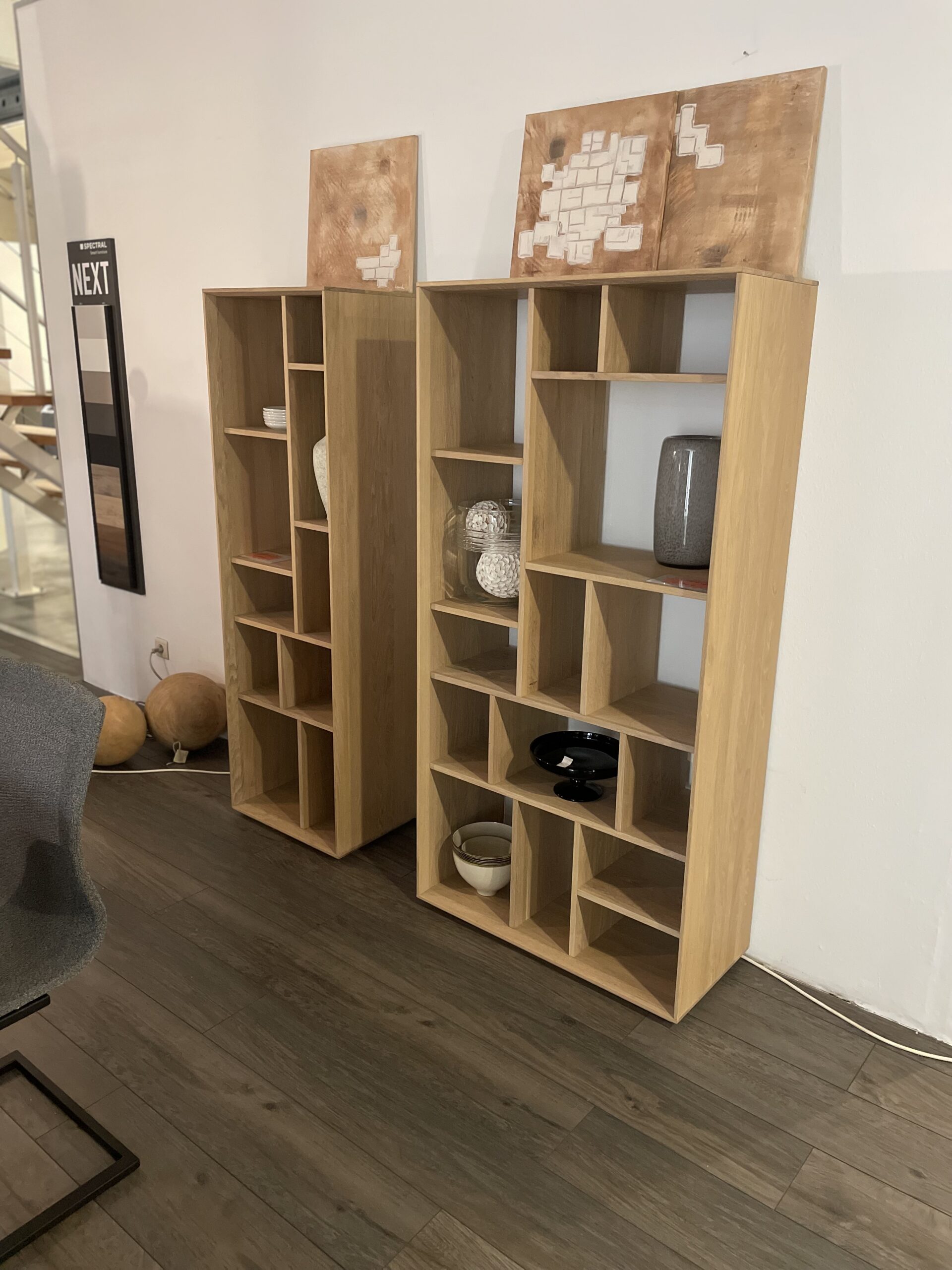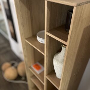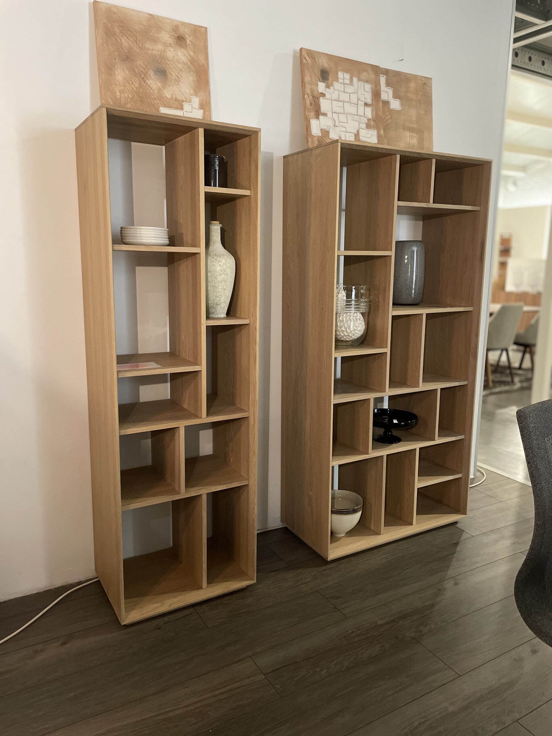 Deux bibliothèques au design graphique et épuré, en chêne massif huilé blanchi.