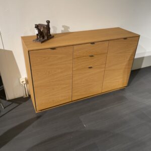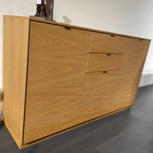 Tijdloos Deens design dat compactheid en functionaliteit combineert. Dit dressoir met 3 deuren en 2 laden biedt vier houten planken voor royaal bergruimte. Aluminium handgrepen en randelementen voegen een hedendaags tintje toe. Afwerking in natuurlijk geolied eikenhout-fineer.