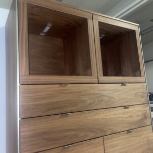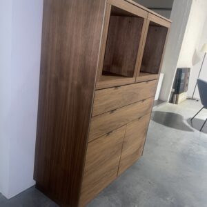 Elegant meubel in geolied notenhoutfineer, met 2 open vakken met verlichting, 2 deuren en 2 lades.