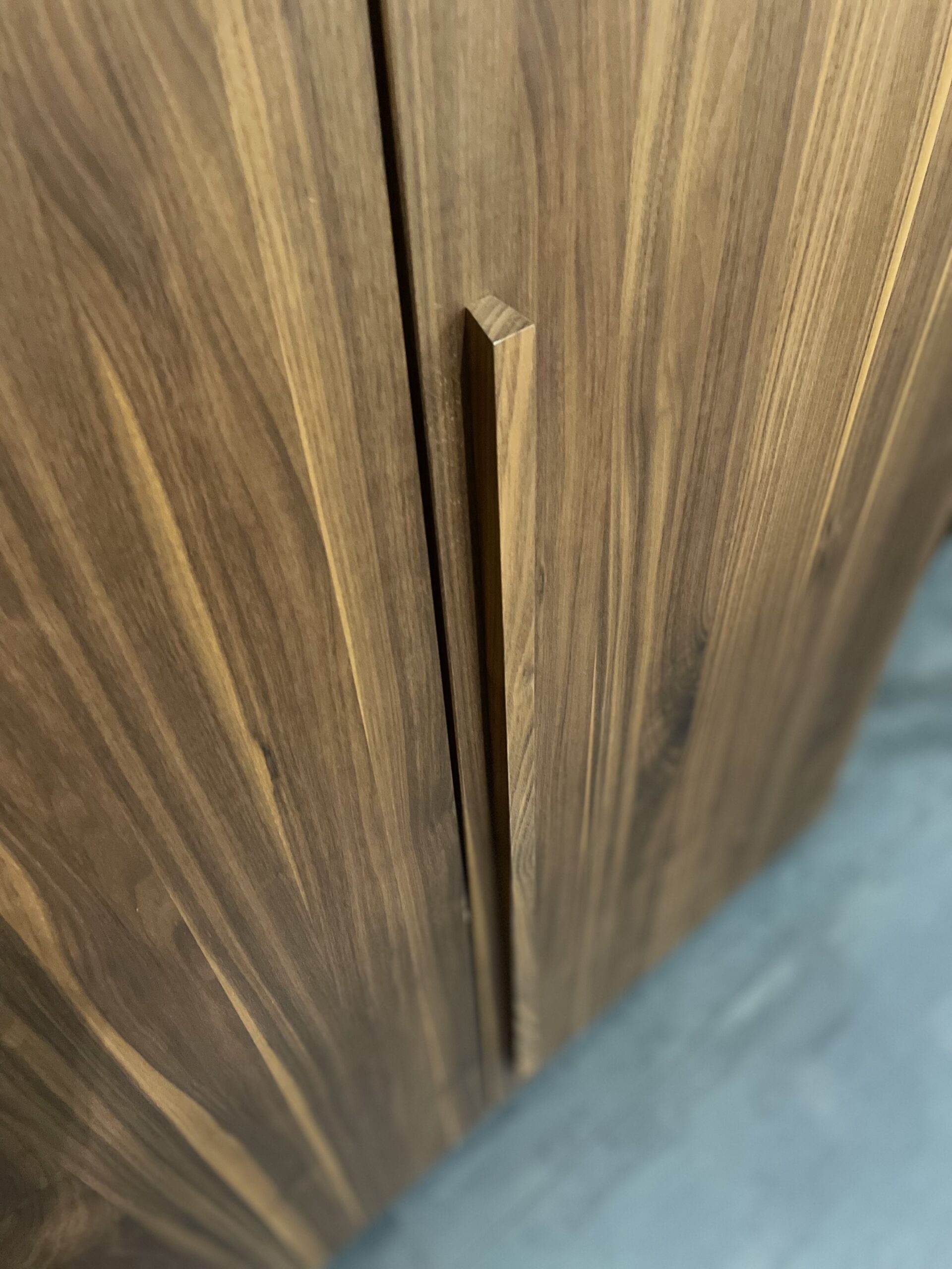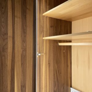 Een stijlvolle en warme kast, met massief notelaar aan de buitenkant en massief beukenhout aan de binnenkant.