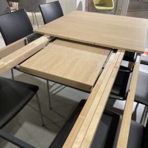 Elegante en praktische tafel in witgeoliede eikenfineer, met 3 geïntegreerde verlengbladen.